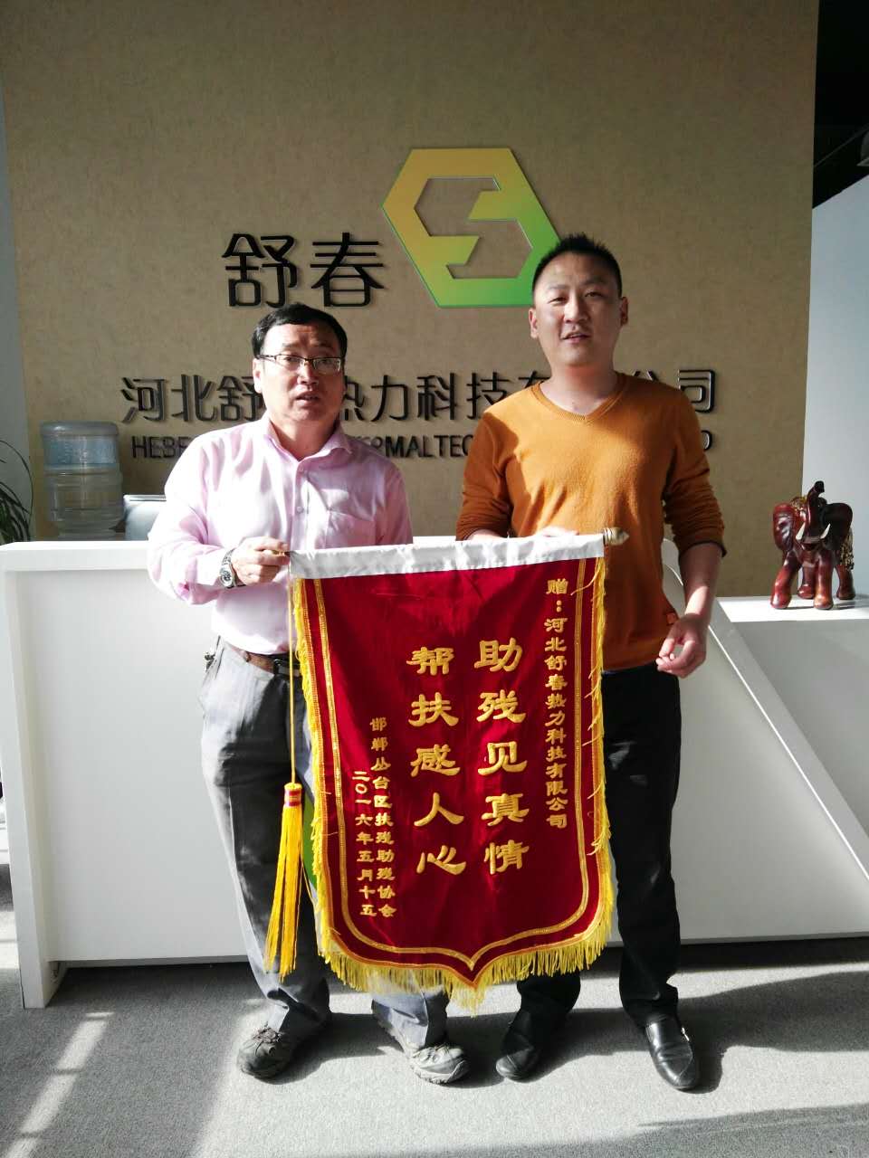 5月17日,邯鄲市殘聯肢殘人協會副主席、叢臺區(qū)殘聯肢殘人協會主席張鴻斌來到河北舒春熱力科技有限公司,親自送上錦旗,對河北舒春熱力科技公司的無償捐贈表示衷心的感謝。