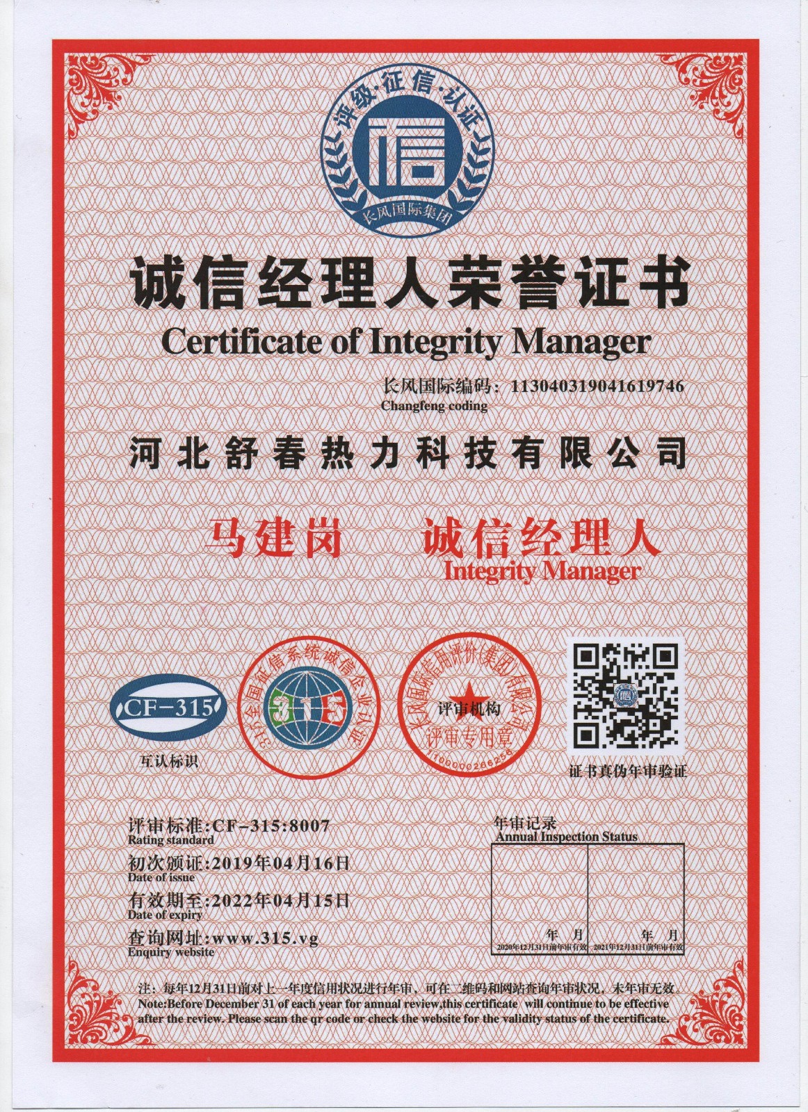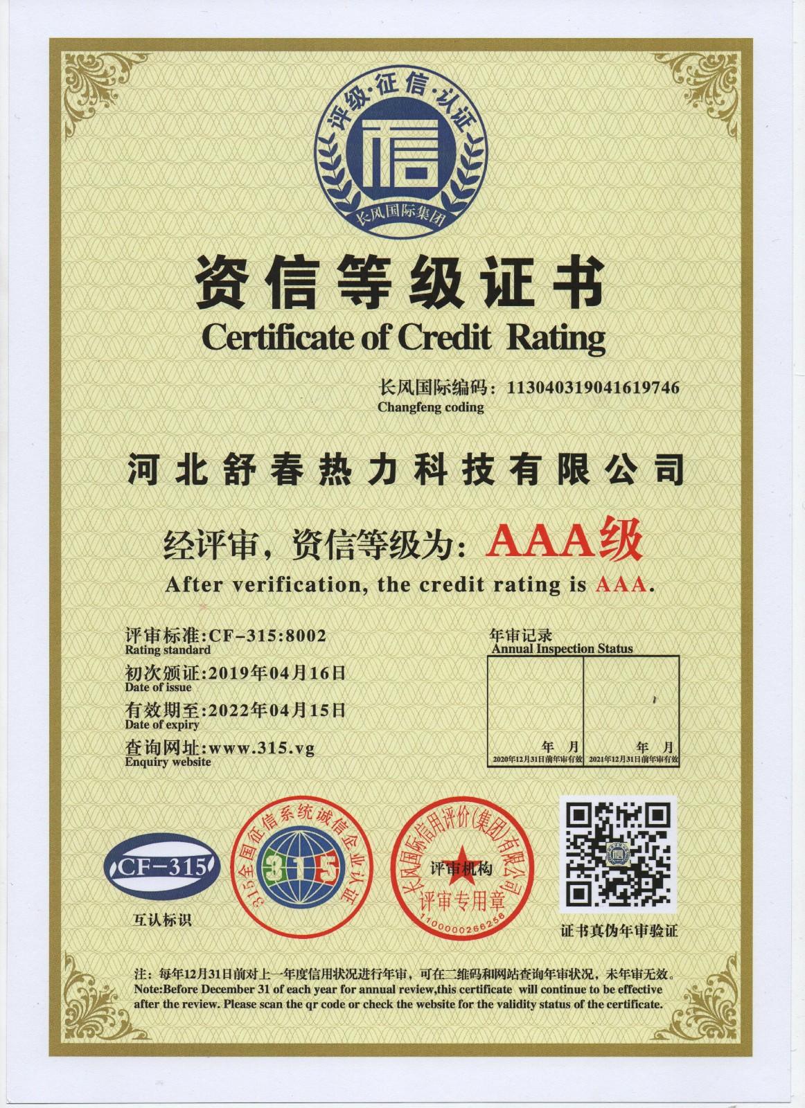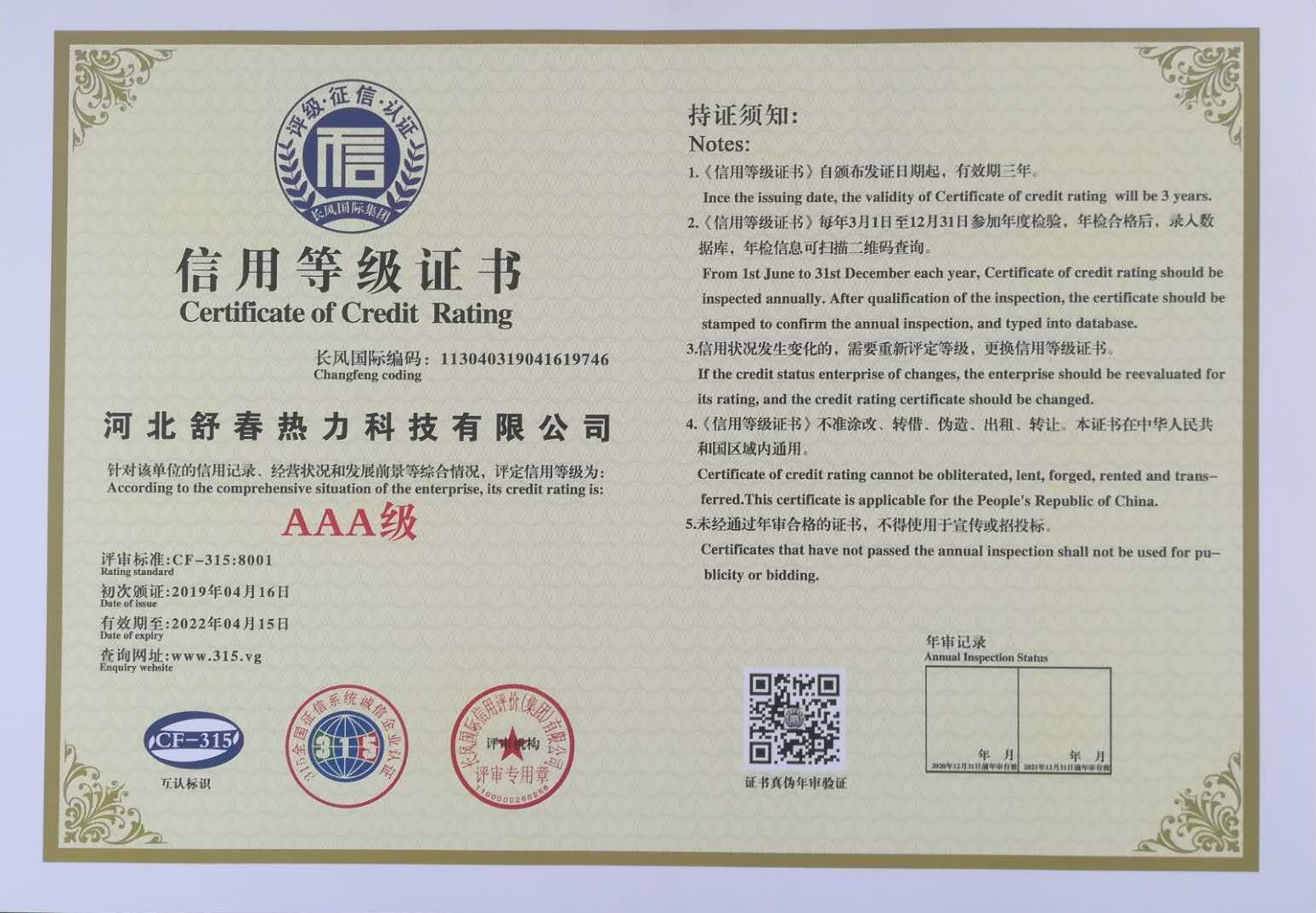 AAA級(jí)信用單位,舒春真誠(chéng)對(duì)待每一個(gè)人 2019年4月16日,河北舒春熱力科技有限公司取得了AAA級(jí)信用單位、誠(chéng)信經(jīng)理人、誠(chéng)信企業(yè)家、AAA級(jí)質(zhì)量服務(wù)信譽(yù)單位、 AAA級(jí)重合同守信用單位、AAA級(jí)誠(chéng)信經(jīng)營(yíng)示范單位、AAA級(jí)資信等級(jí)、AAA級(jí)信用等級(jí)。
