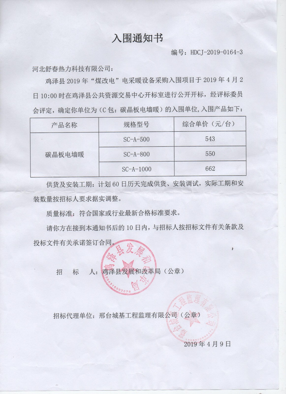 “煤改電”舒春在行動 2019年4月9日,河北舒春熱力科技有限公司收到了來自雞澤縣發(fā)展和改革局的雞澤縣2019年“煤改電”電采暖設(shè)備采購入圍 項(xiàng)目C包:碳晶板電墻暖入圍通知書。 并于2019年4月18日正式簽訂采購安裝合同。