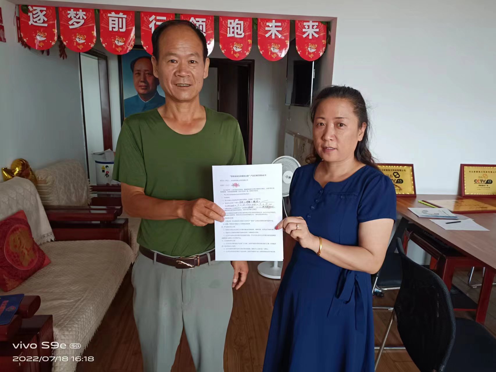 祝賀邵總簽約魏縣總代理 寒來暑往,秋收冬藏。盡管現(xiàn)在是酷暑伏天,我們還是得為冬季嚴(yán)寒取暖做好充分的準(zhǔn)備。今年我們公司生產(chǎn)研發(fā)了一款高效電采暖熱水器。這款產(chǎn)品是“煤改電”用戶和家里安裝暖器片、地暖居民的取暖最佳替代品。它節(jié)能省電、節(jié)約空間,受到廣大用戶的贊美和認(rèn)可。 邵總非常關(guān)注和認(rèn)可這款產(chǎn)品,7月18日邵總成功簽約魏縣總代理